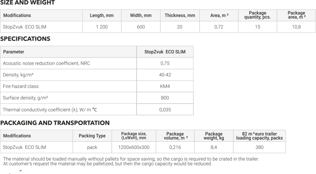 StopZvuk ECO SLIM – მცირე სისქის ხმის მშთანთქავი ფილები, რომელიც დამზადებულია პოლიესტერის ბაზაზე თერმული შეერთებების გზით. მცირე სისქე – 20 მმ, უზრუველყოფს მინიმალური ფართის გამოყენებით პროფესიონალური ხმის საიზოლაციო სისტემის შექმნას. ნატურალური პოლესტერის გამოყენების შედეგად პროდუქტი 100% -ით ეკოლოგიურად სუფთაა და უსაფრთხოა ნებისმიერი დანიშნულებით გამოყენებისას.