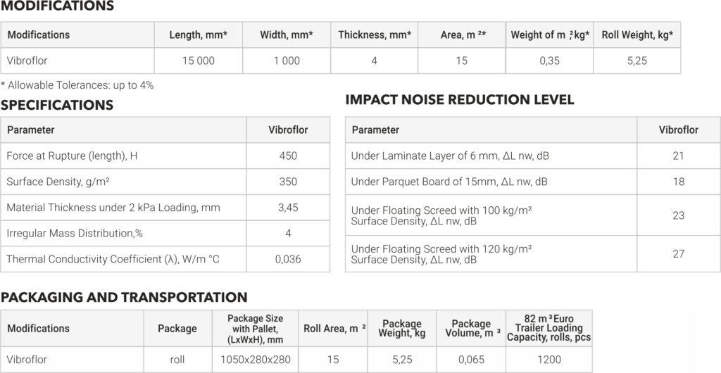 Vibroflor – სპეციალური ხმის საიზოლაციო რულონური ტიპის მასალაა, რომელიც დამზადებულია პირველადი პოლიესტერის ბაზაზე და პასუხობს თანამედროვე სამშენებლო აკუსტიკურ მოთოვნებს. გამოიყენება იატაკის აპლიკაციაში, როგორც დარტყმითი ხმაურის საიზოლაციო ფენა. VibroFloor-ის გამოყენება ხდება როგორც მოჭიმული იატაკის ქვეშ ასევე მის ზემოდ, უშუალოდ ლამიტანის, პარკეტისა თუ სხვა საბოლოო იატაკის საფენის ქვემოდ.